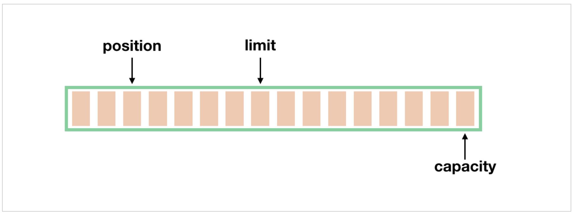 就像数组有数组容量,每次访问元素要指定下标,Buffer 中也有几个重要属性:position、limit、capacity。