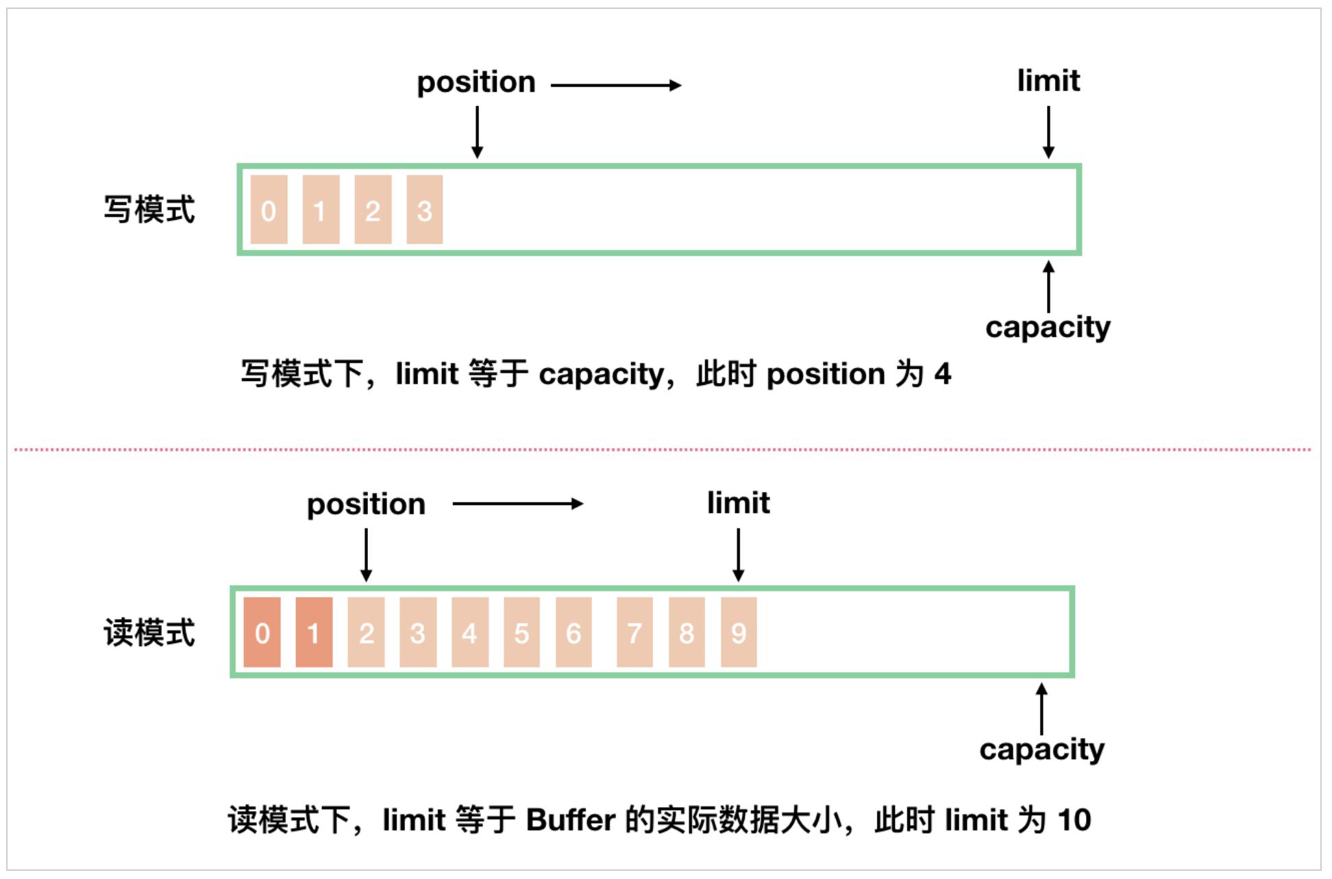 Limit:写操作模式下,limit 代表的是最大能写入的数据,这个时候 limit 等于 capacity。写结束后,切换到读模式,此时的 limit 等于 Buffer 中实际的数据大小,因为 Buffer 不一定被写满了。